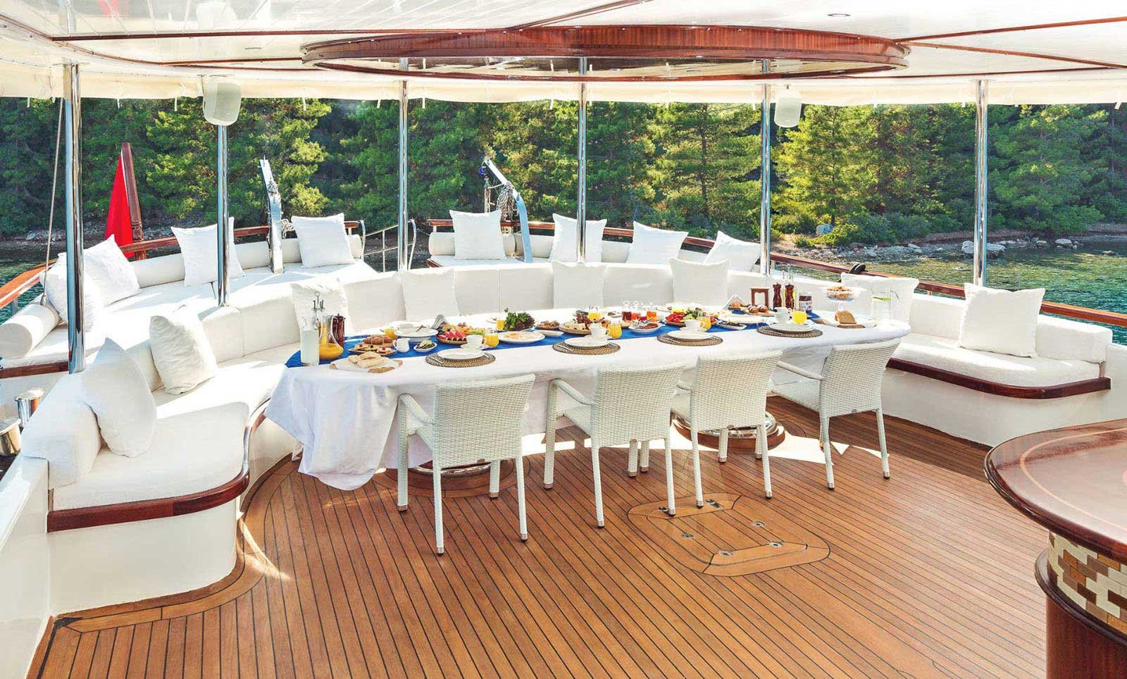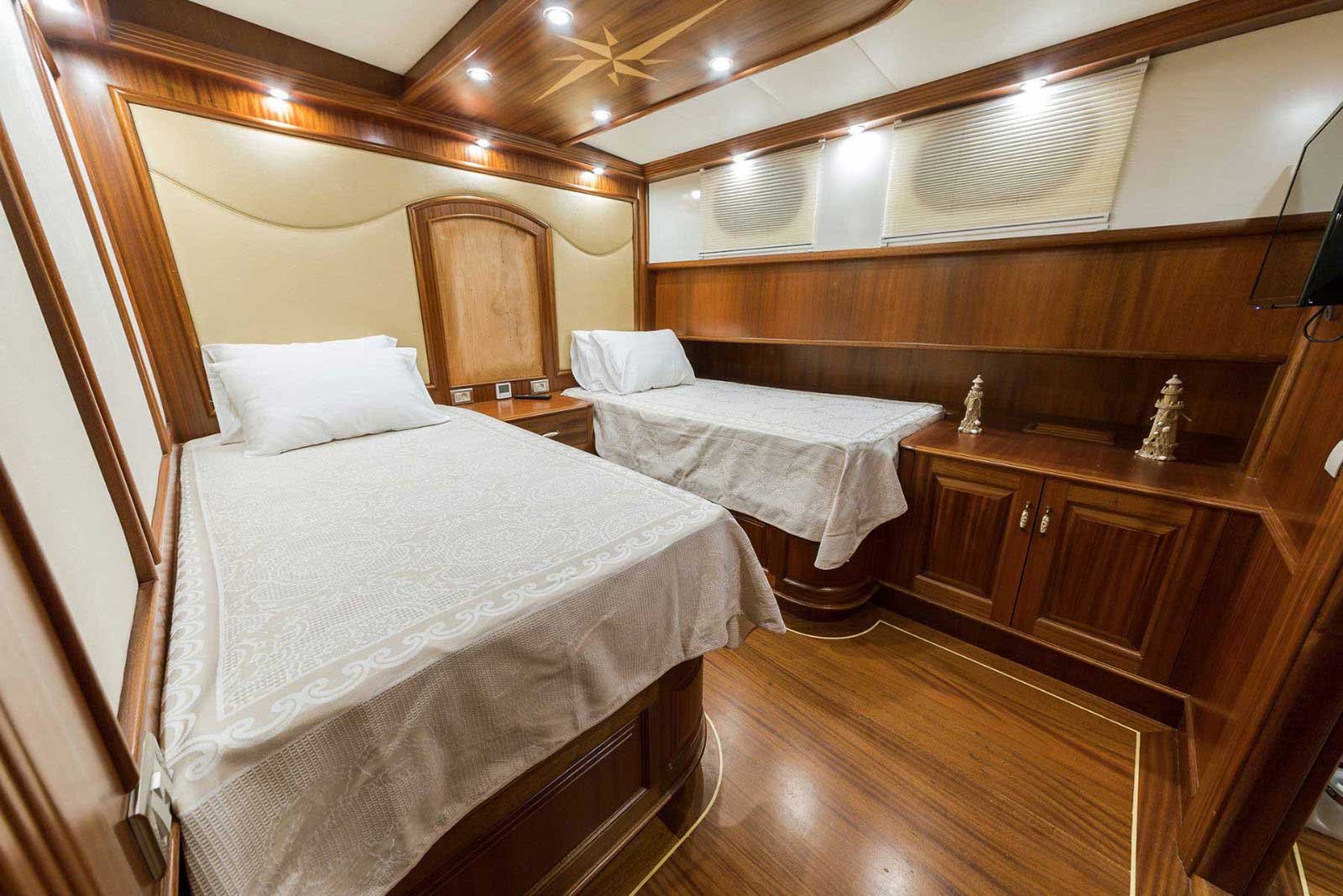 Air-conditioned 2 King Size Suit Cabines, 2 Vip Suit Cabin, 2 Twin Cabins, 2 Double Suit Cabins with all private shower and toilets. Satellite TV and Music system are available in the saloon. Dining table and seating area in saloon and on the front deck. Foredeck sun bathing mattresses and seating area, Aft deck dining table and sunbathing mattresses, Separate cabins for the crew