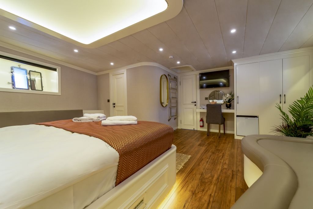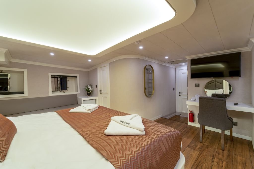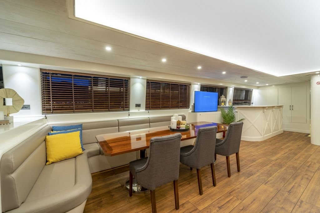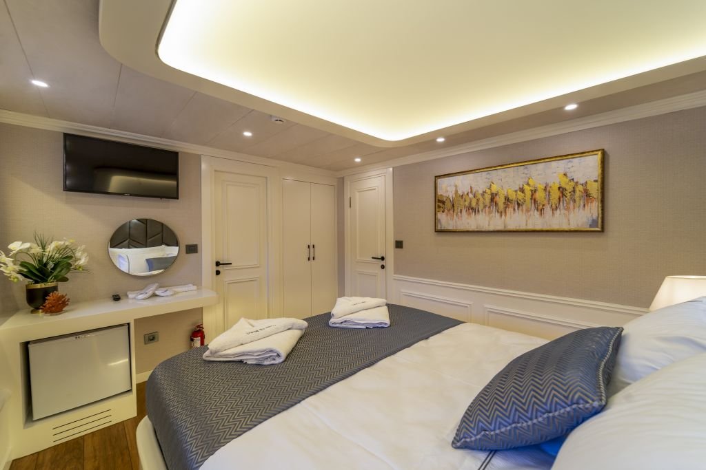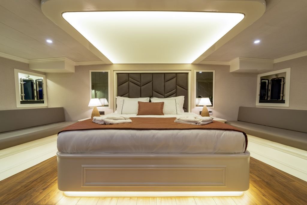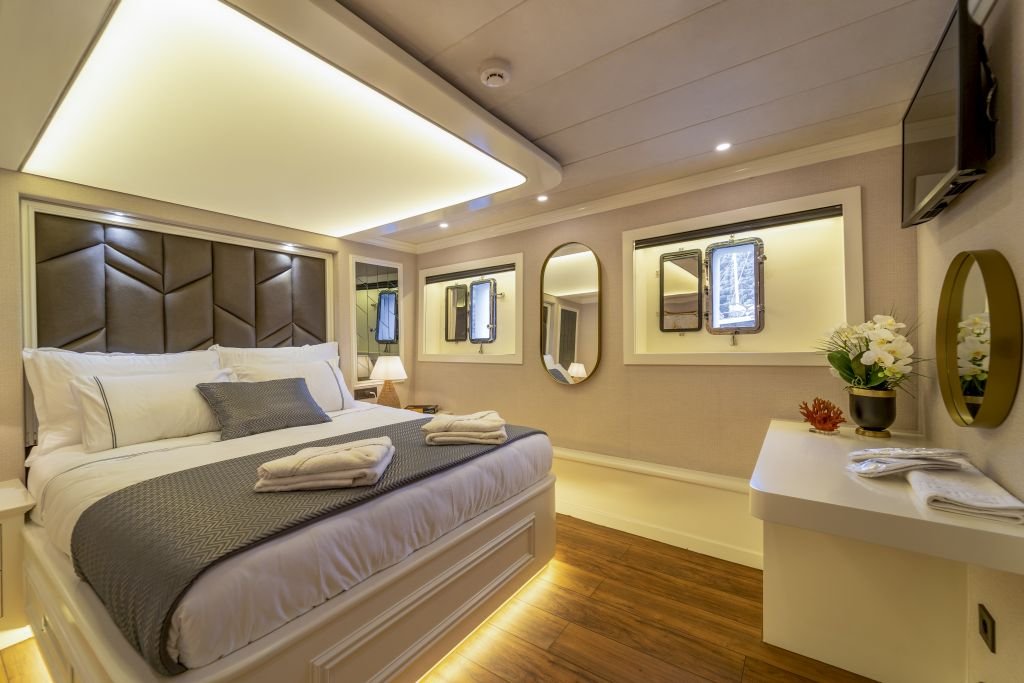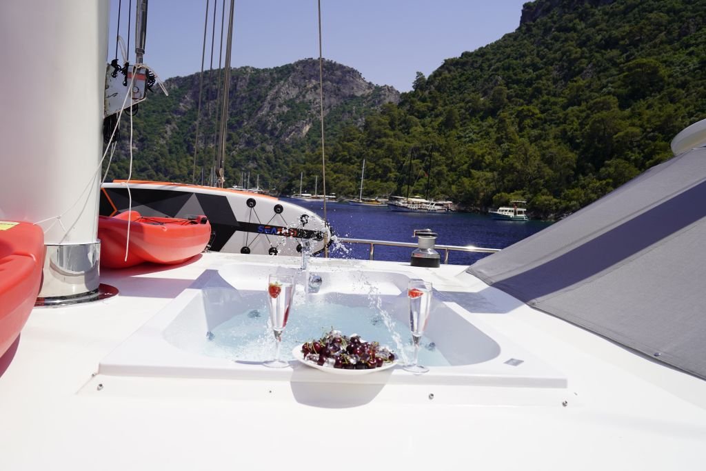 Fully air-conditioned 2 Master cabins , 3 Double bed cabins and 1 Twin bed cabin with private shower and toilets, Dining table and spacious seating area in salon, Foredeck sun bathing and seating area, Jacuzzi, Flybridge seating and dining, Outdoor dining table and aft deck seating mattresses,Separate cabins for crew