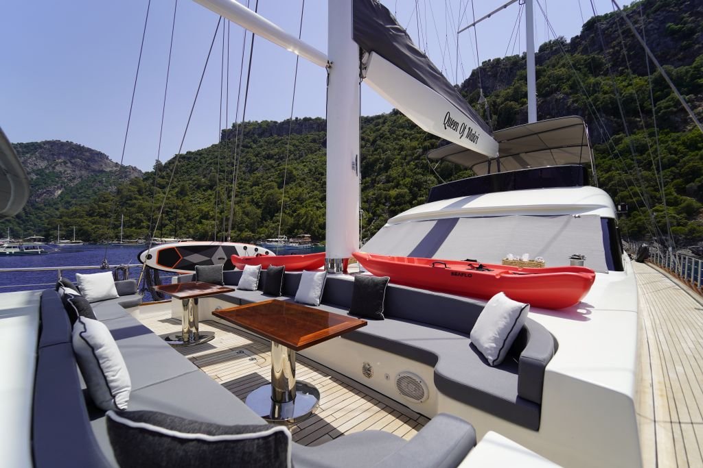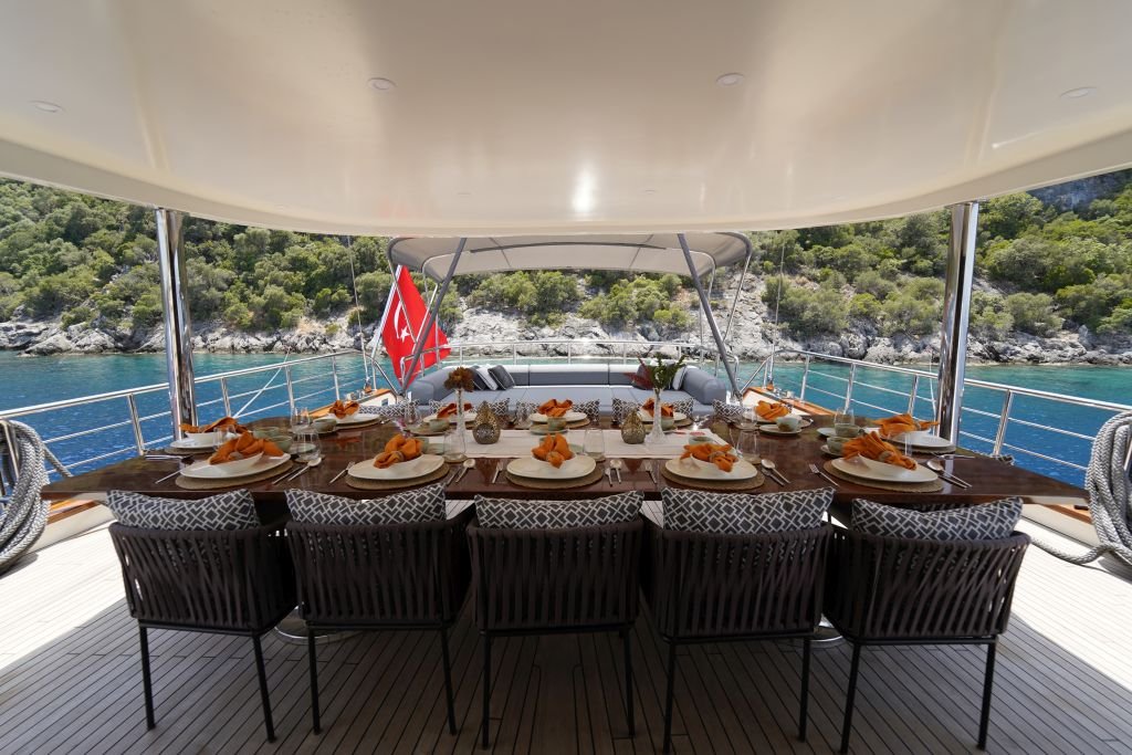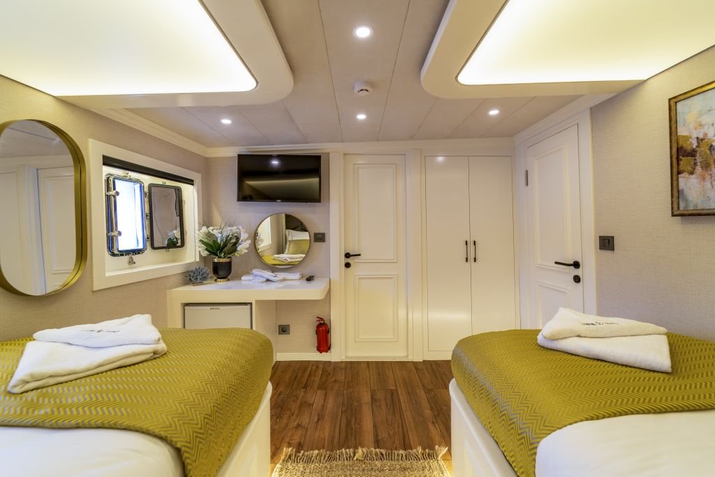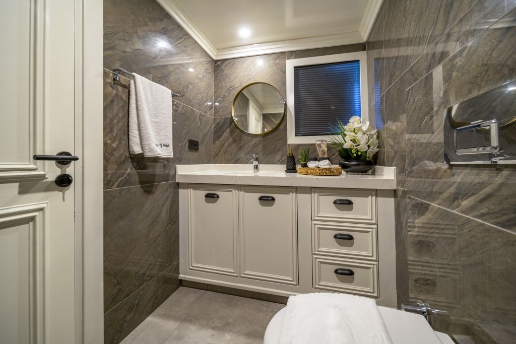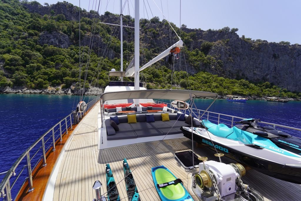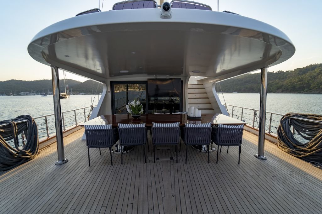 Fully air-conditioned 2 Master cabins , 3 Double bed cabins and 1 Twin bed cabin with private shower and toilets, Dining table and spacious seating area in salon, Foredeck sun bathing and seating area, Jacuzzi, Flybridge seating and dining, Outdoor dining table and aft deck seating mattresses,Separate cabins for crew