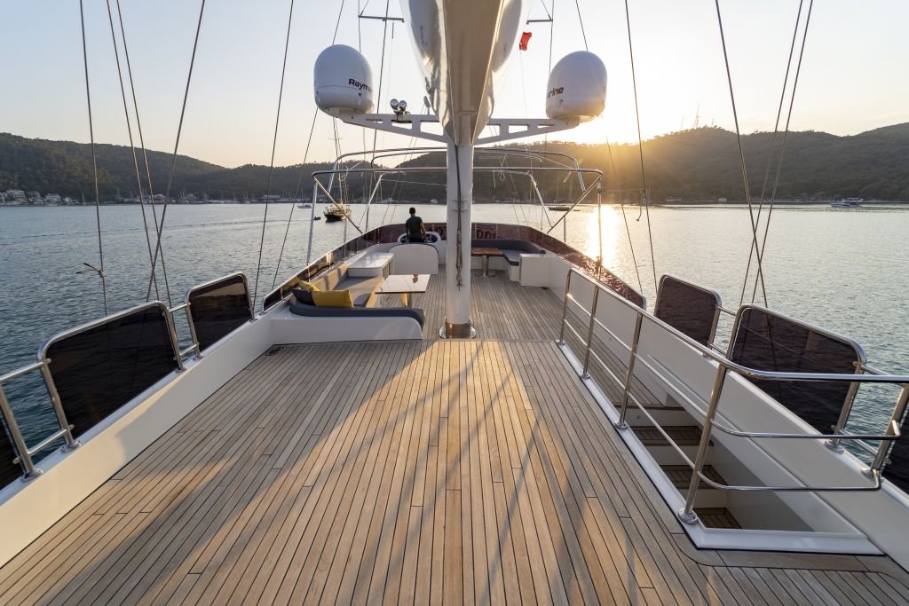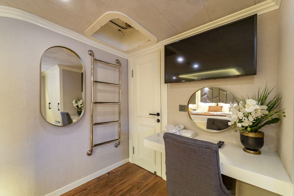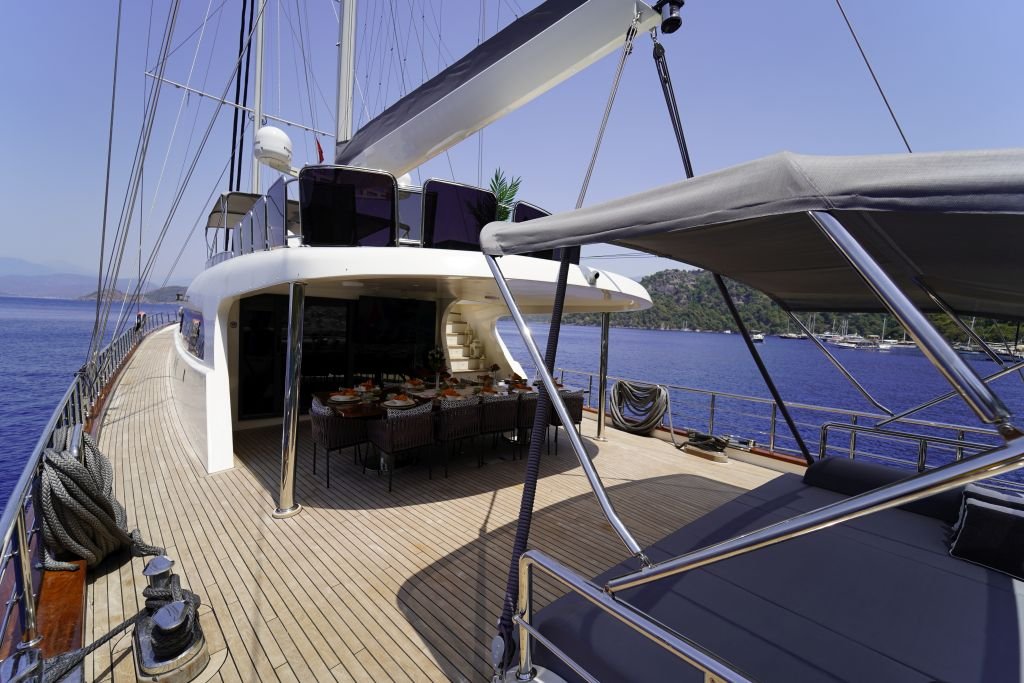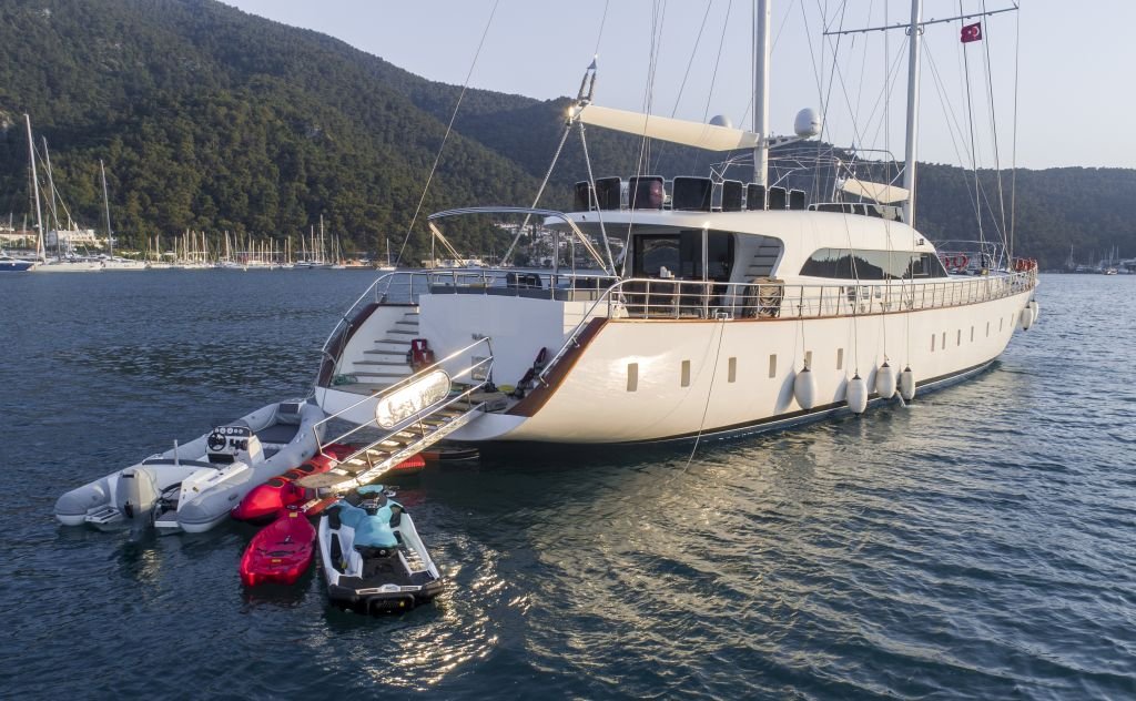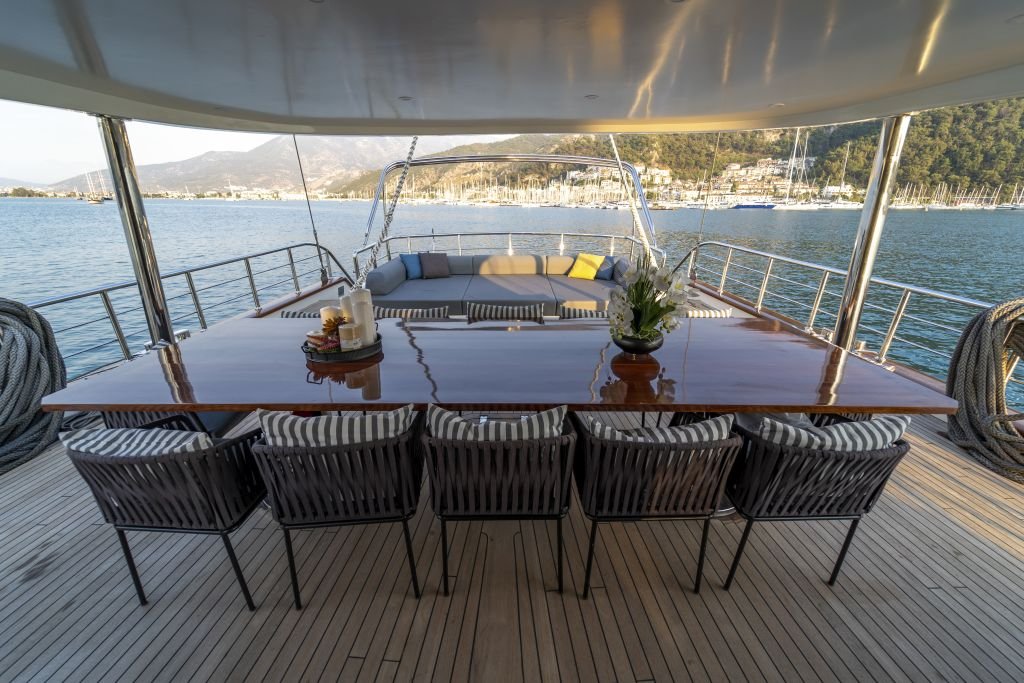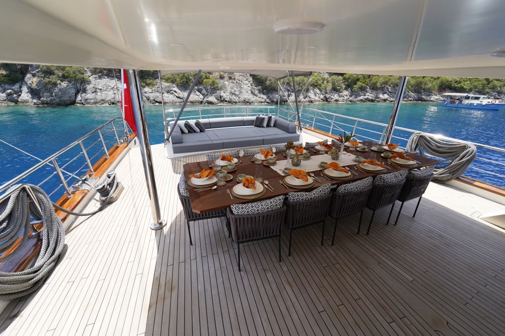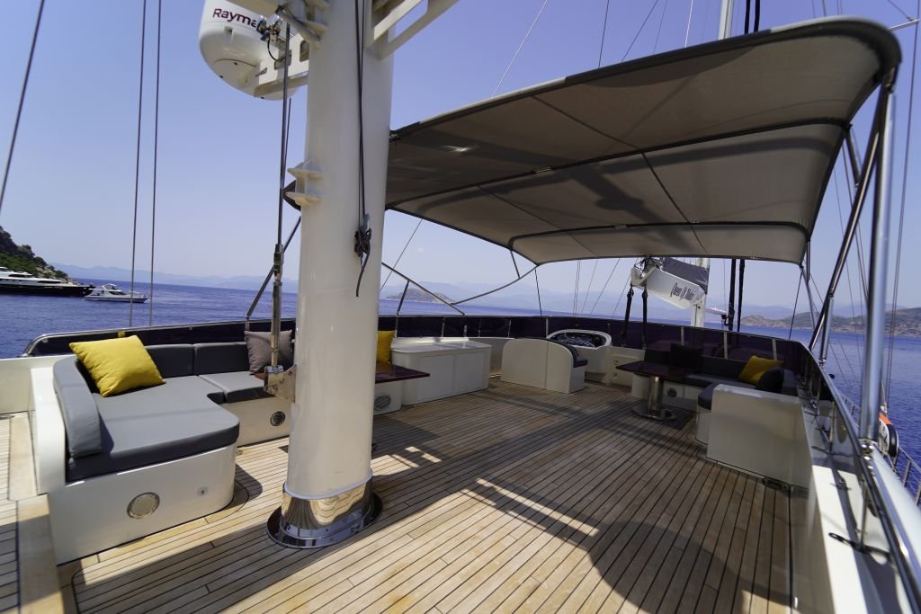 Fully air-conditioned 2 Master cabins , 3 Double bed cabins and 1 Twin bed cabin with private shower and toilets, Dining table and spacious seating area in salon, Foredeck sun bathing and seating area, Jacuzzi, Flybridge seating and dining, Outdoor dining table and aft deck seating mattresses,Separate cabins for crew