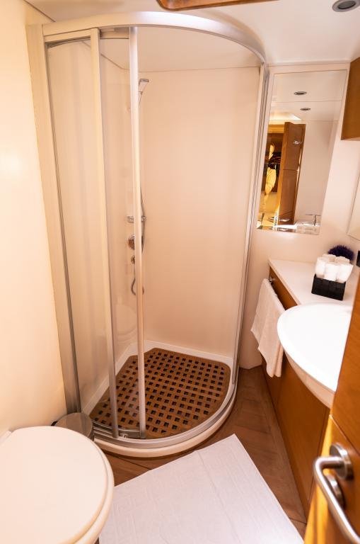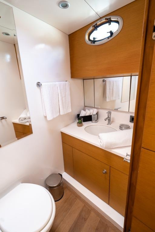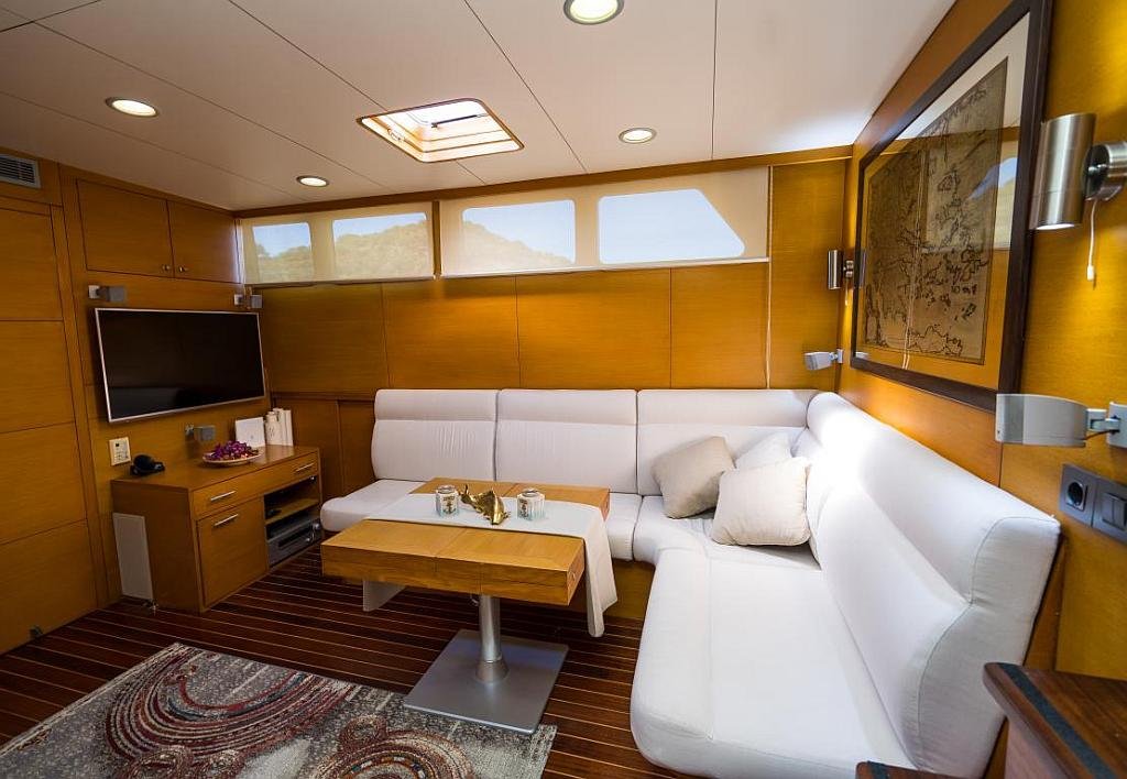 Klimalı 1 Master ve 2 Double yataklı kabinler, Her kabinde tuvalet ve duşakabin Salonda oturma alanı ve yemek masası, Ön güvertede güneşlenme minderleri, Arka güvertede oturma alanı ve yemek masası, Personel için ayrı kabin