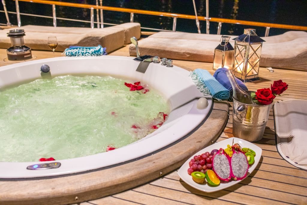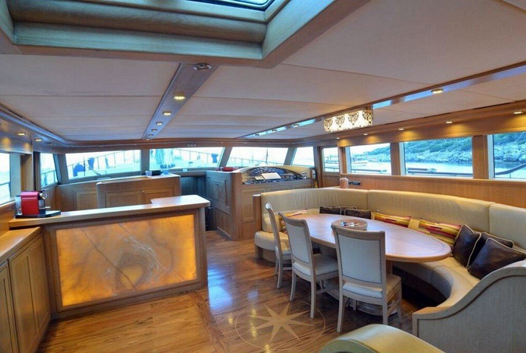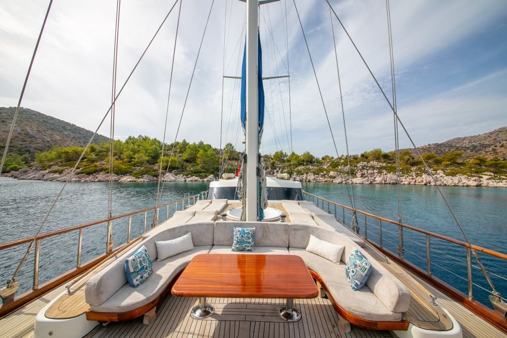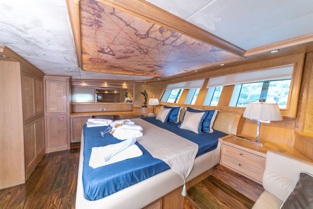 Air-conditioned 2 Master ( foredeck master with jacuzzi ), 2 Double and 1 single bed cabins with private shower with hydromassage and electrical toilets, Satellite TV and music system, Hair dryer and safebox in cabins, Dining table and seating area in the salon, Foredeck sun bathing mattresses and seating area, Aft deck dining table and cushioned seating, Separate cabins for the crew