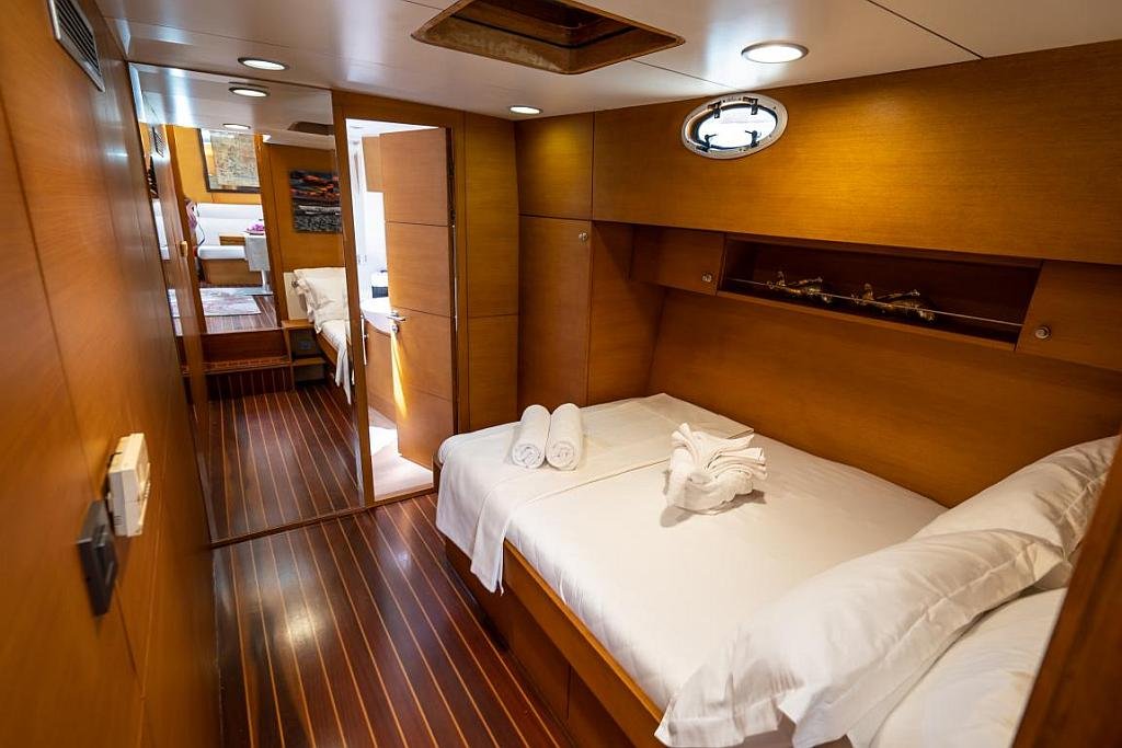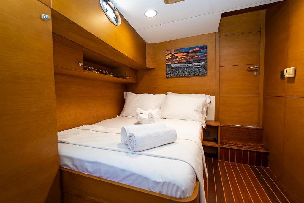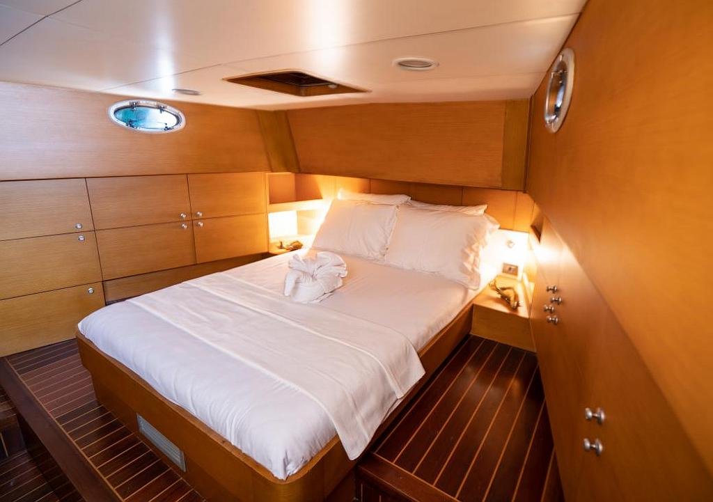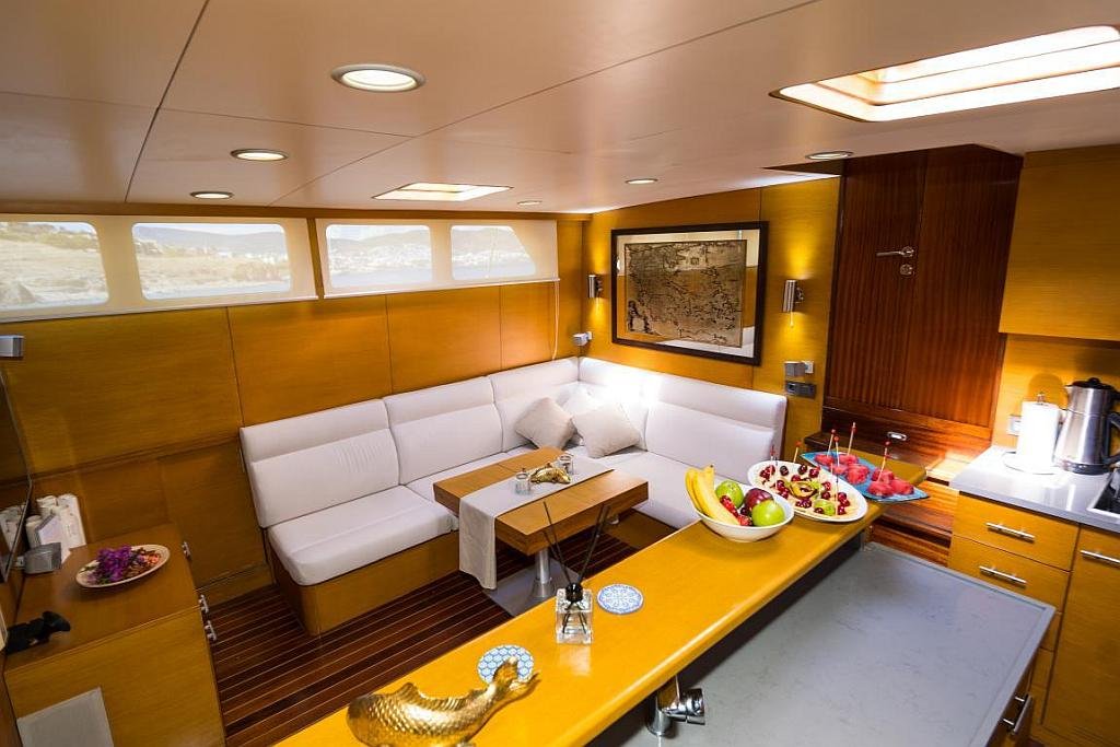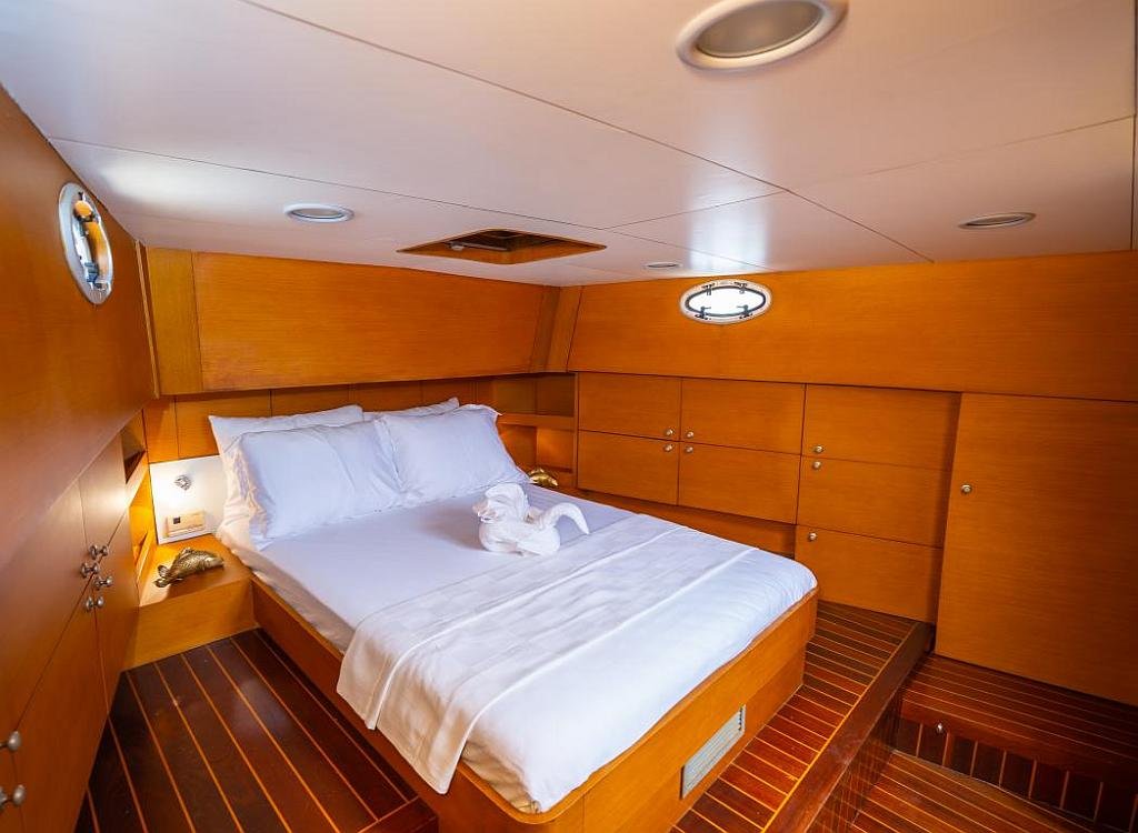 Klimalı 1 Master ve 2 Double yataklı kabinler, Her kabinde tuvalet ve duşakabin Salonda oturma alanı ve yemek masası, Ön güvertede güneşlenme minderleri, Arka güvertede oturma alanı ve yemek masası, Personel için ayrı kabin