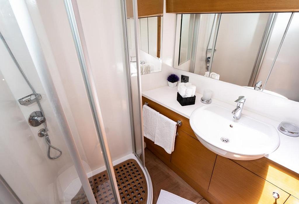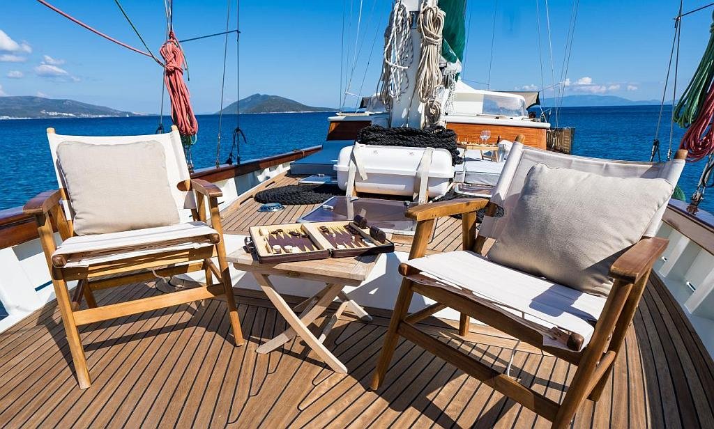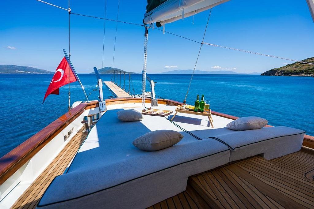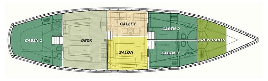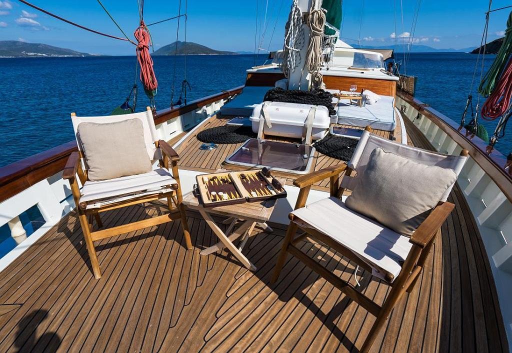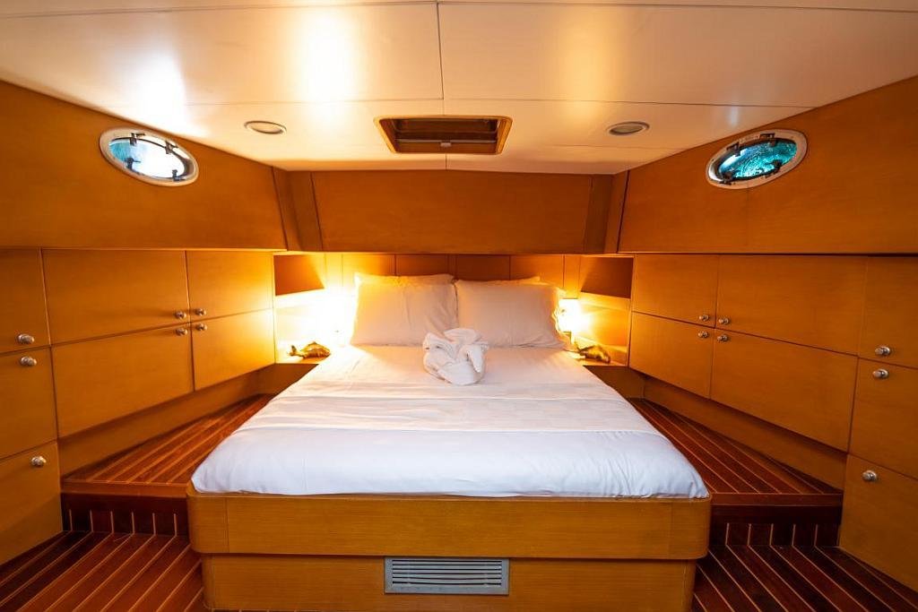 Klimalı 1 Master ve 2 Double yataklı kabinler, Her kabinde tuvalet ve duşakabin Salonda oturma alanı ve yemek masası, Ön güvertede güneşlenme minderleri, Arka güvertede oturma alanı ve yemek masası, Personel için ayrı kabin