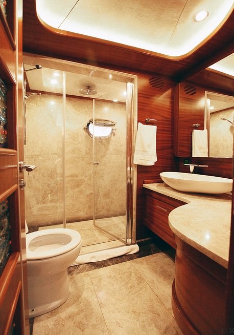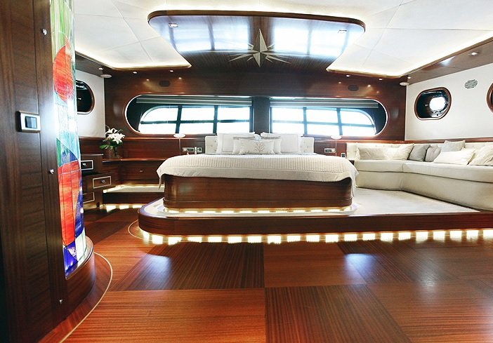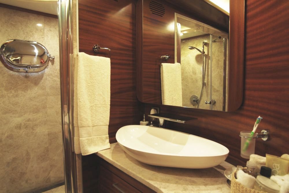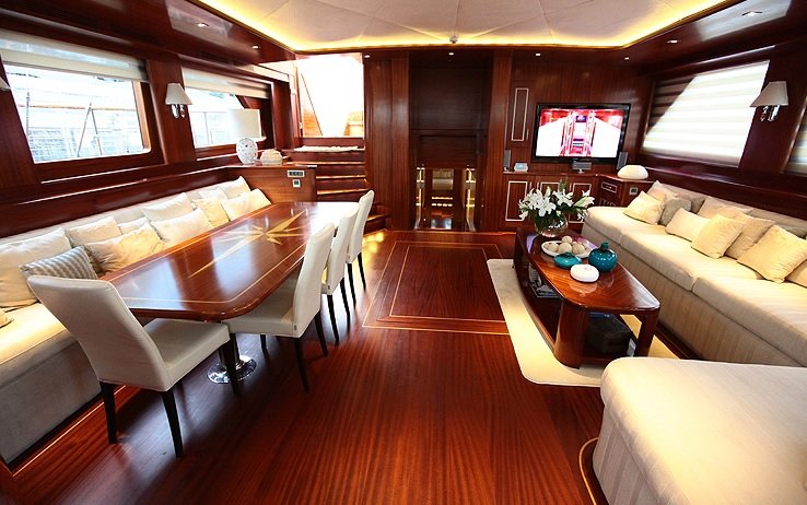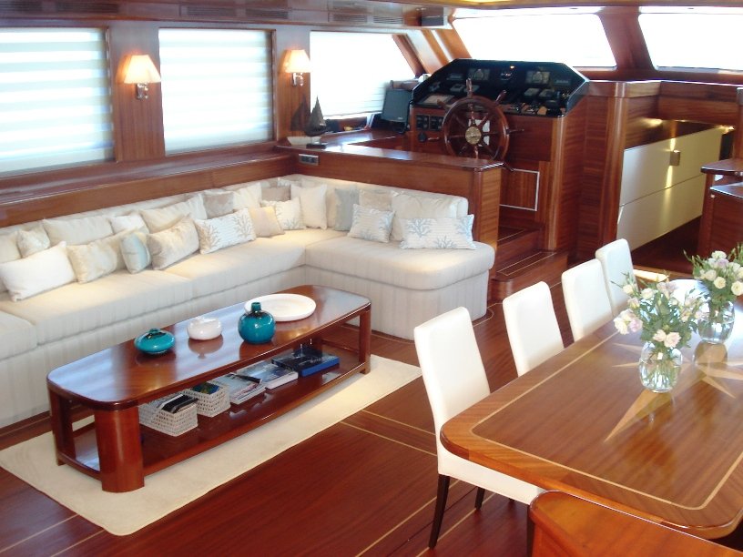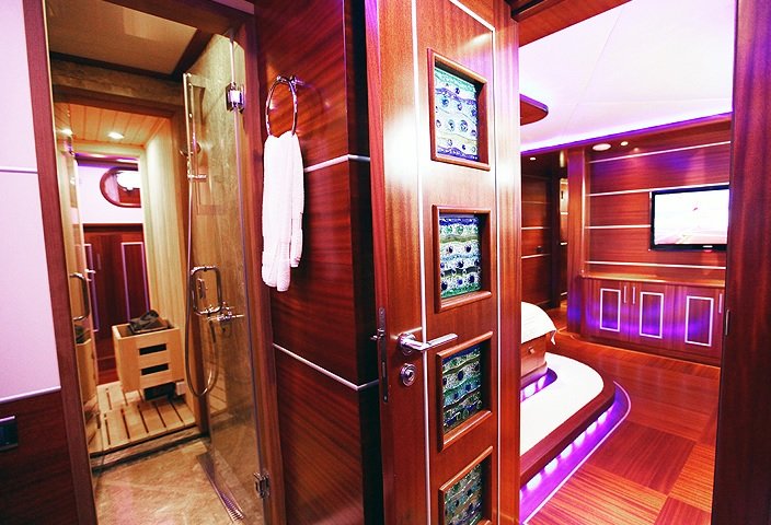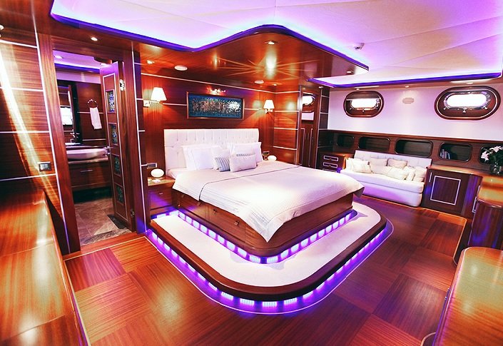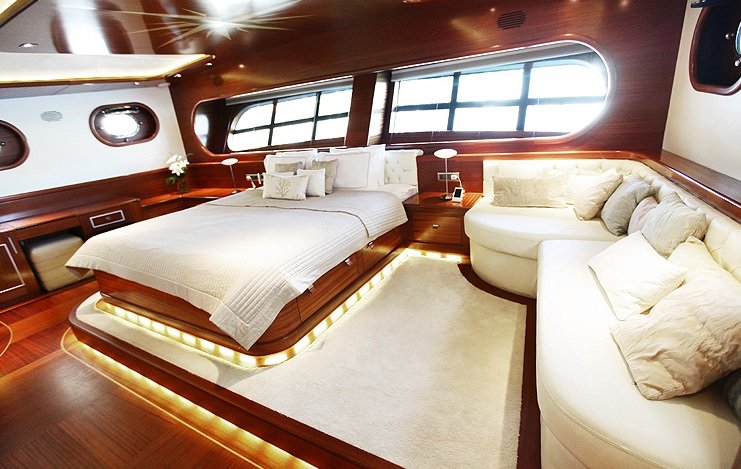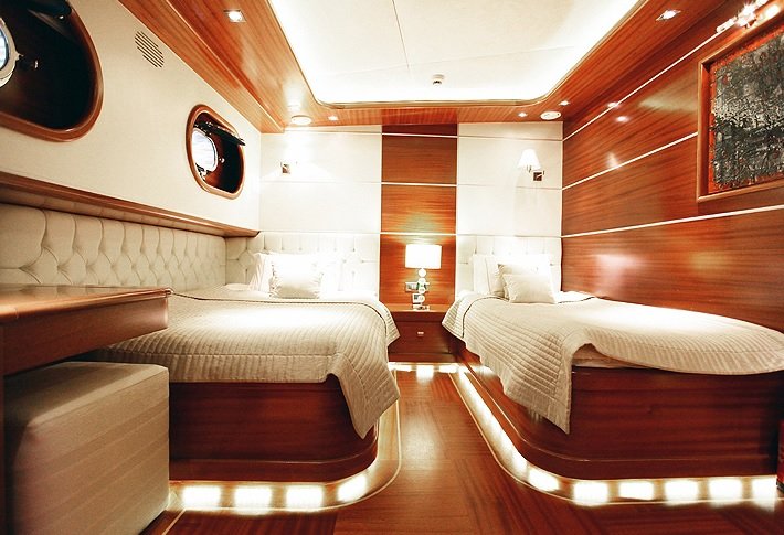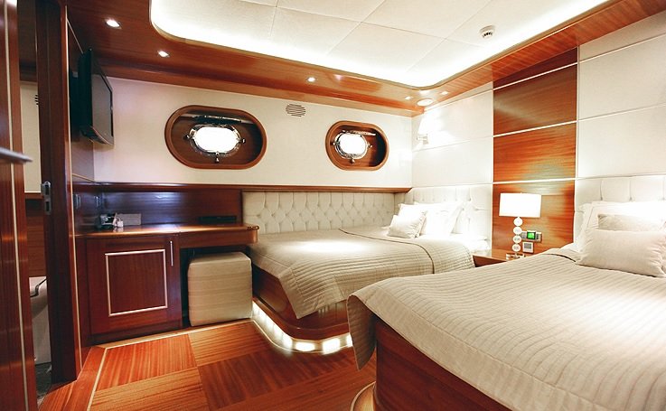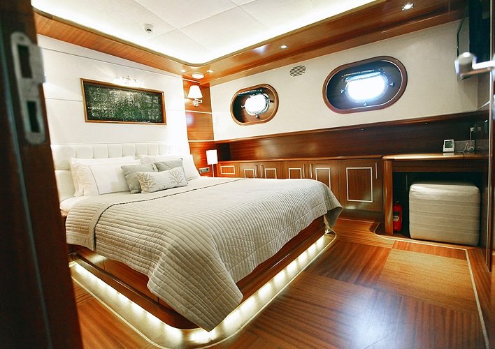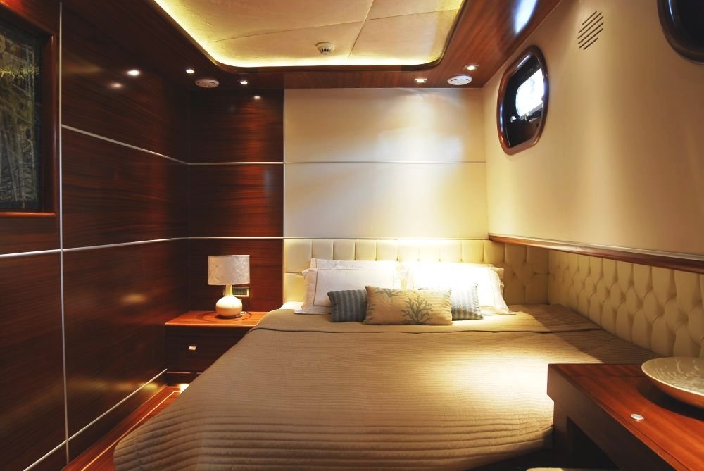Klimalı 2 Master kabin, sauna ( ön master kabinde ), 2 Double yataklı ve 2 Twin yataklı kabin, Her kabinde ayrı duşakabin + elektrikli tip tuvalet, Kabinlerde Lcd TV ve mini bar, Salonda oturma alanı ve Yemek masası, Arka güvertede minderler ve yemek masası, Ön güvertede oturma grubu ve güneşlenme minderleri Personel için ayrı kabin ve yaşam alanı.