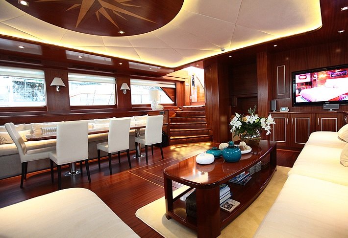 TV (uydu sistem) kabinlerde ve salonda ve Müzik sistemi, Navigasyon ekipmanları, Derin dondurucu, Buzdolabı, Buz yapıcı, Çamaşır ve Bulaşık makinası. Tavla ve Oyun kartları.